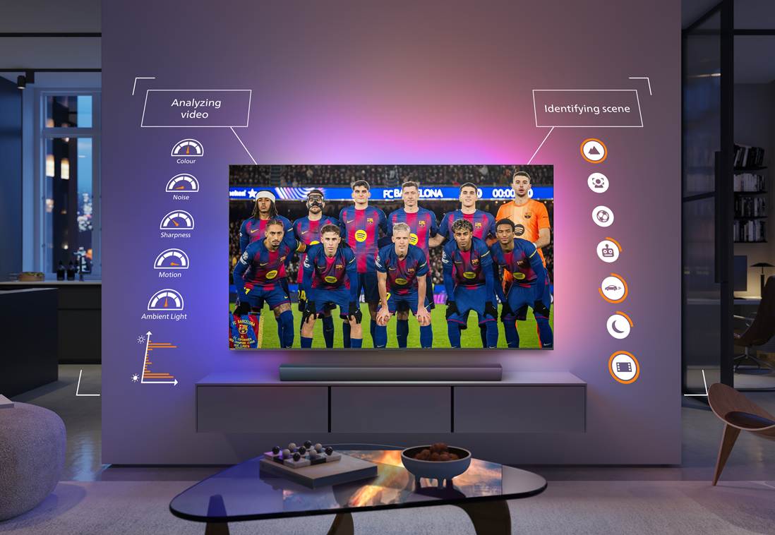 当亚马尔带球撕开防线,荷兰皇家飞利浦环景光专利技术,以光影溢出屏幕,通过屏幕后的智能LED灯泡,实时将屏幕画面以光影投射到背景,营造百变的炫彩环境,点燃流光溢彩的氛围感。“光随影动”、“光随声动”、“艺术壁画”三种模式,光影律动与球场节奏精准同频,打造多样的沉浸氛围,让进球瞬间的红色浪潮、攻防转换的急促光影突破屏幕边界,全方位包裹视野,带来观赛的视觉沉浸。