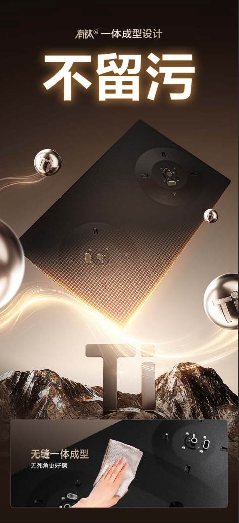 钛金属表面还具有独特物理特性——疏水疏油。微观世界下,钛金属表面能级较低,使水和油分子难以铺展附着。通俗来说,油污和水滴落在表面时无法抓住金属,而是形成圆润珠子滚落。这一特性完美解决厨房清洁难的痛点。传统灶具油污易渗入缝隙,干结后极难清理;而苏泊尔有钛防爆灶得益于钛金属疏水疏油特性,油污无法附着,水渍一抹即干。无论是烹饪后汤汁飞溅,还是长期油垢积累,只需轻轻一擦即可光亮如新。