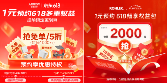 卫浴品类方面,箭牌1元锁定多重权益包,全店抢半价、大额返现、下单送赠品等多重权益。科勒推出1元锁定价值2000元权益包,包含至高返现200元,指定类目免费拆旧、智能马桶可享6年质保、满额赠好礼等。法恩莎1元可享返红包、6期免息、31天价保等专属特权。汉斯格雅1元权益包内含实付满2000元返100元京东E卡、满额赠好礼、跨品类满减、福利款5折、赠品可折现以及免费安装服务。