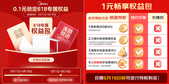 为方便消费者提前锁定618优惠,4月20日至4月30日,用户每日通过搜索关键词进入早鸟权益会场,或进入京东建材官方直播间,即可抢5折早鸟券,也可通过1元抢购618早鸟权益包。成功购买权益包的用户,可获得大额返现、免费送装拆旧、全周期价保、延期仓储等多项权益。这些权益从5月1日起即可兑换使用,权益使用一直延续到6月18日,旨在全方位降低购买成本,解决消费顾虑。
