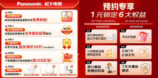 浴霸品类中,松下浴霸1元预定专享权益包涵盖实付满1000元送100元现金、晒单送LED厨卫灯、以旧换新至高补贴30元、免费安装加送拆旧服务、整机5年质保再赠延保一年、30天价保。公牛浴霸1元锁定6大权益,包括实付满999元送公牛夜灯魔方、平台补贴券、Y29智能浴霸晒单返京豆、价保7天价保无忧、部分商品免费包安装、7天无理由退货。