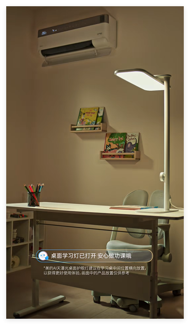 对于有孩子的家庭,美的全屋智能则用科技之力,营造出了专属的学习环境。当家长说出“小美小美,孩子要学习了”的需求,“专注学习”模式便即刻唤醒。孩子一入座,大路灯自动点亮,精准匹配阅读学习所需的光线参数;窗帘缓缓闭合,隔绝外界的喧嚣与干扰;空调自动切换为无风感模式,避免直吹带来的不适。在舒适的氛围中,孩子更能全身心投入知识的海洋,父母也由此多了一份安心,少了一份操心。