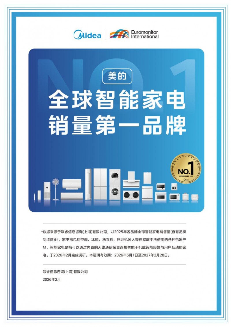 据欧睿信息咨询(上海)有限公司数据显示,2025年美的全球智能家电销量位居行业第一,以绝对优势领跑全球智能家电市场。