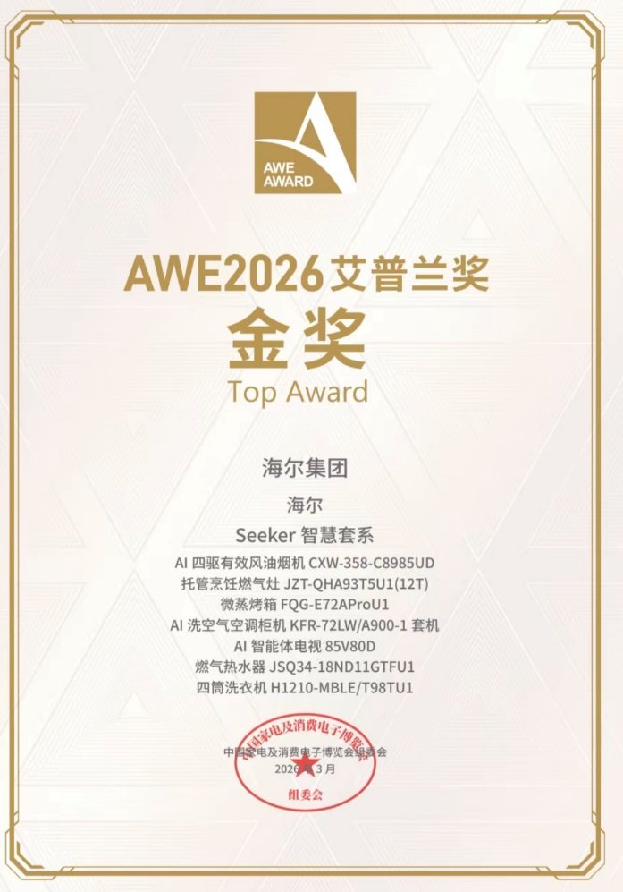 此外,也正是凭借着“主动感知、自然交互、自决策”的AI能力,海尔SeekerV80D还获得了被誉为“全球智慧生活领域奥斯卡”的艾普兰金奖,受到行业专家的高度赞赏。