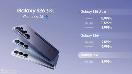 三星Galaxy S26 系列提供幽夜紫、映雪白、旷宇黑与浅云蓝四款配色,以及绯霞金与镜月银两款专属色,三星Galaxy S26 Ultra厂商建议零售价9,999元起,三星Galaxy S26+厂商建议零售价7,999起,三星Galaxy S26厂商建议零售价6,999元。2月26日03点,三星Galaxy S26系列已在三星商城、三星京东自营官方旗舰店、天猫三星官方旗舰店、抖音三星官方旗舰店等线上渠道以及线下授权三星门店正式开启预约。成功预约三星Galaxy S26系列的消费者,可有机会享受加价升杯购机福利(S26 Ultra 512GB升杯至1TB 加价1600元、S26 Ultra/S26+ 256GB升级至512GB加价800元),3月5日24点前成功预约的消费者还可享有提前发货权益。