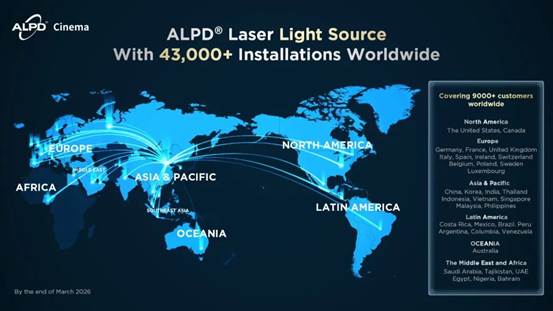 截至目前,ALPD®激光光源在全球市场的累计安装量已突破4.3万套,服务网络覆盖北美、亚太、非洲、拉丁美洲、欧洲及中东等地区,惠及全球超过9000家影院。随着新一代光源的正式推出,ALPD®将持续依托CinemaCon等国际舞台,为全球影院伙伴带来更高效、更灵活的品质升级选择。