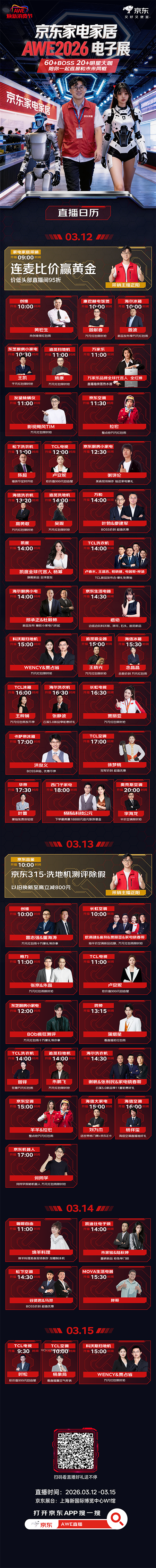 作为家电及消费电子领域的重要年度盛会,AWE一直是品牌展示前沿技术、发布重磅新品、连接消费者的重要窗口。今年是AWE的35周年,也是京东与AWE携手同行的第15年,围绕本届展会,京东将整合平台、品牌与内容资源,推出1000余场直播,把展会热度与消费场景更紧密地连接起来。消费者在关注行业趋势和产品创新的过程中,也能更直观地了解产品亮点、选购重点和优惠信息。
