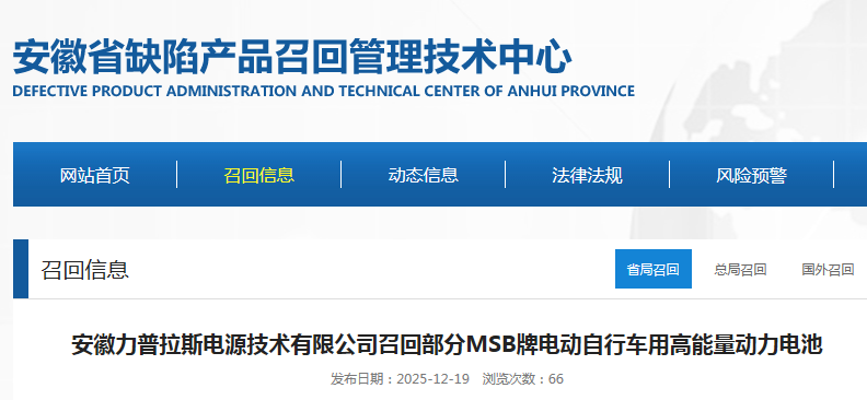 家电消费网1月2日讯 昨天,安徽力普拉斯电源技术有限公司按照《消费品召回管理暂行规定》的要求,主动向安徽省市场监督管理局、淮北市市场监督管理局备案了召回计划,决定自即日起,召回2025年9月4日生产的MSB牌电动自行车用高能量动力电池(规格:6-EVF-33.3),涉及数量4000只。