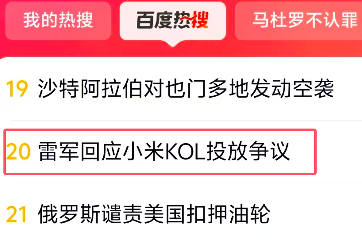 “雷军回应小米KOL投放争议”冲上百度热搜