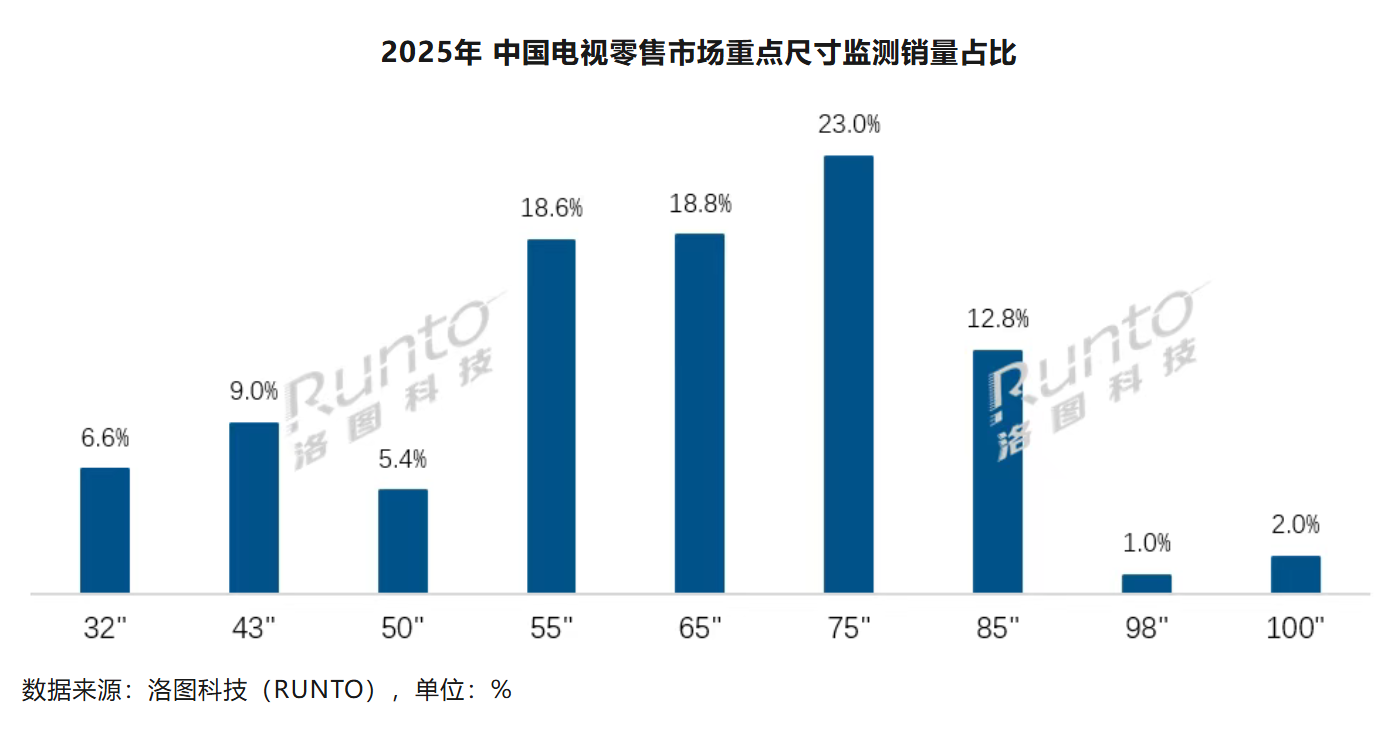 洛图科技监测数据显示,2024年,中国市场的电视尺寸按销量排位还是75、65、55和43英寸;而到2025年变成了75、65、55和85英寸,全部集中到了中大尺寸。同时,TOP4尺寸的合并零售量占比超过了七成。