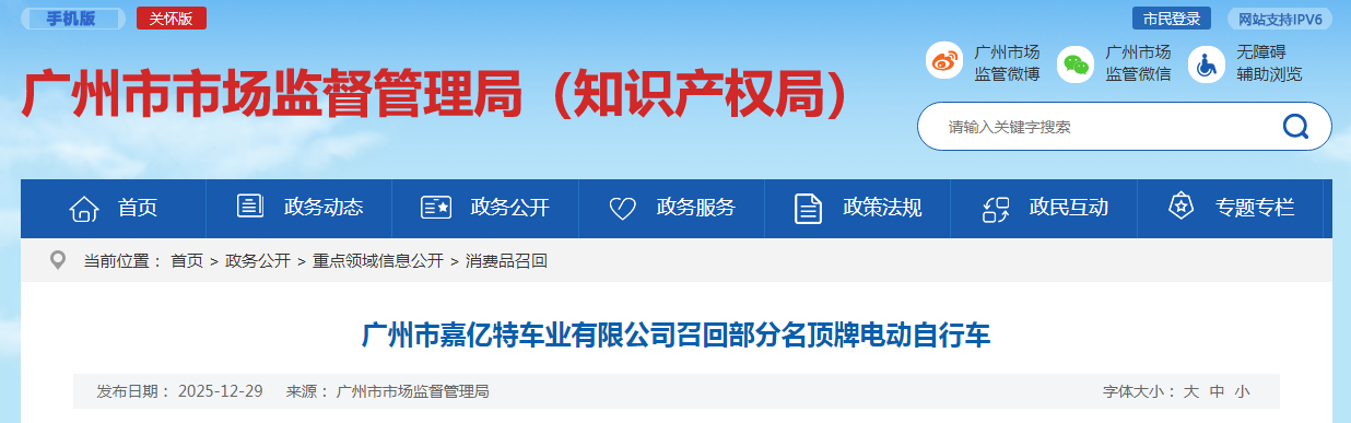 嘉亿特车业召回部分名顶牌电动自行车 存引发后车追尾等问题