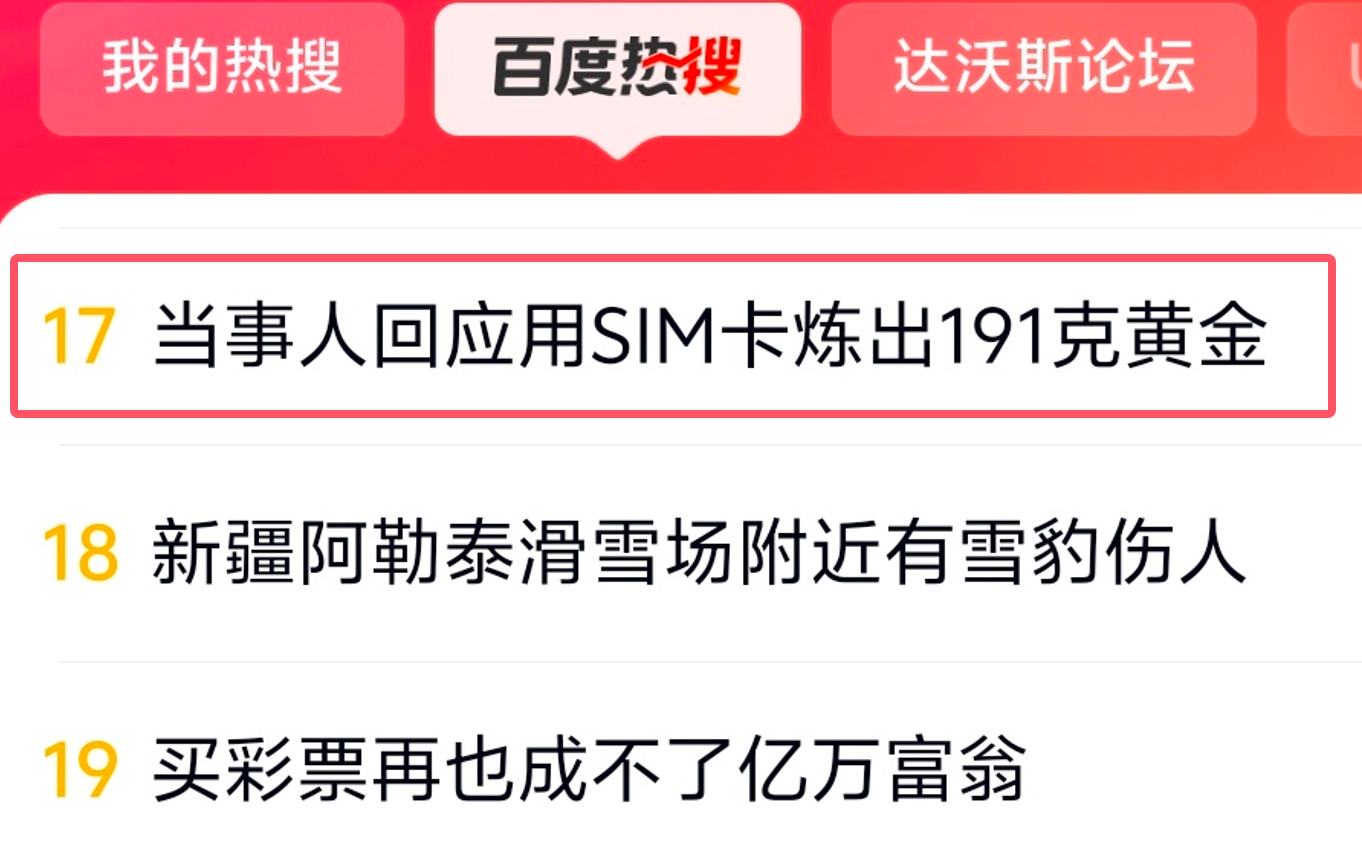 家电消费网1月23日讯 今天,“当事人回应用SIM卡炼出191克黄金”冲上百度热搜。