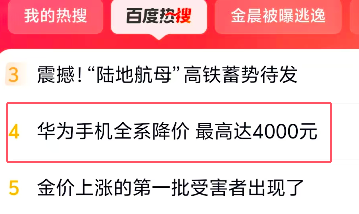 “华为手机全系降价最高达4000元”冲上百度热搜