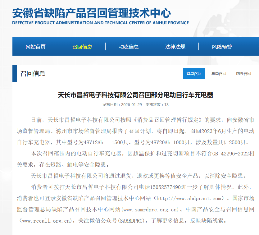 家电消费网1月30日讯 昨天,安徽省昌哲电子科技有限公司按照《消费品召回管理暂行规定》的要求,向安徽省市场监督管理局、滁州市市场监督管理局报告了召回计划,将自即日起,召回2023年6月生产的电动自行车充电器,其中型号为48V12Ah 1500只、型号为48V20Ah 1000只,涉及数量共计2500只。