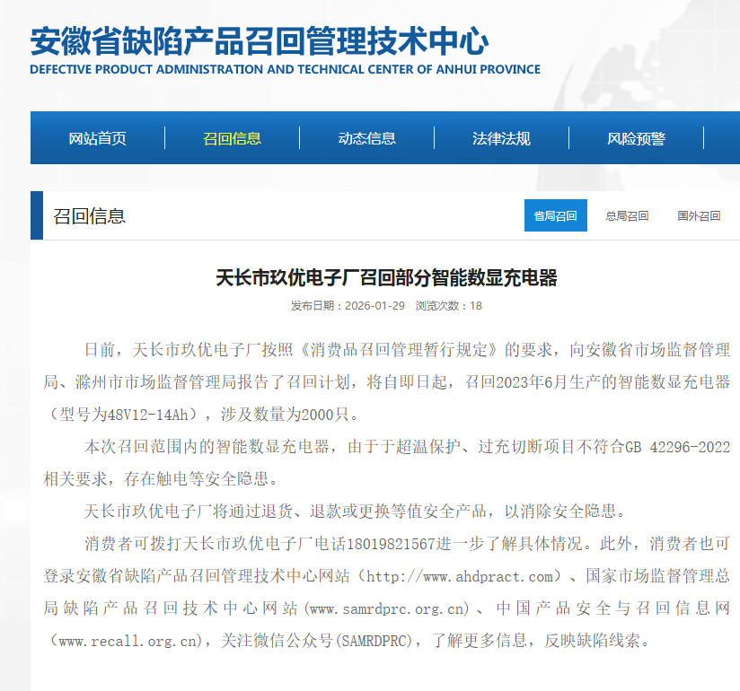 家电消费网1月30日讯 昨天,安徽省玖优电子厂按照《消费品召回管理暂行规定》的要求,向安徽省市场监督管理局、滁州市市场监督管理局报告了召回计划,将自即日起,召回2023年6月生产的智能数显充电器(型号为48V12-14Ah),涉及数量为2000只。