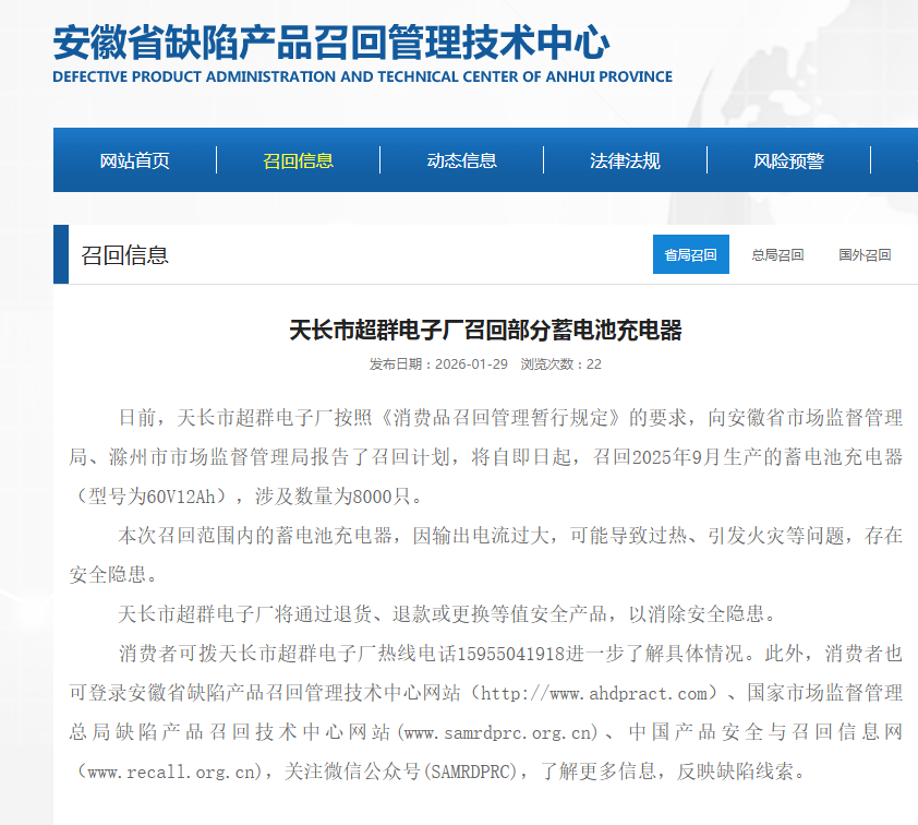家电消费网1月30日讯 昨天,安徽超群电子厂按照《消费品召回管理暂行规定》的要求,向安徽省市场监督管理局、滁州市市场监督管理局报告了召回计划,将自即日起,召回2025年9月生产的蓄电池充电器(型号为60V12Ah),涉及数量为8000只。