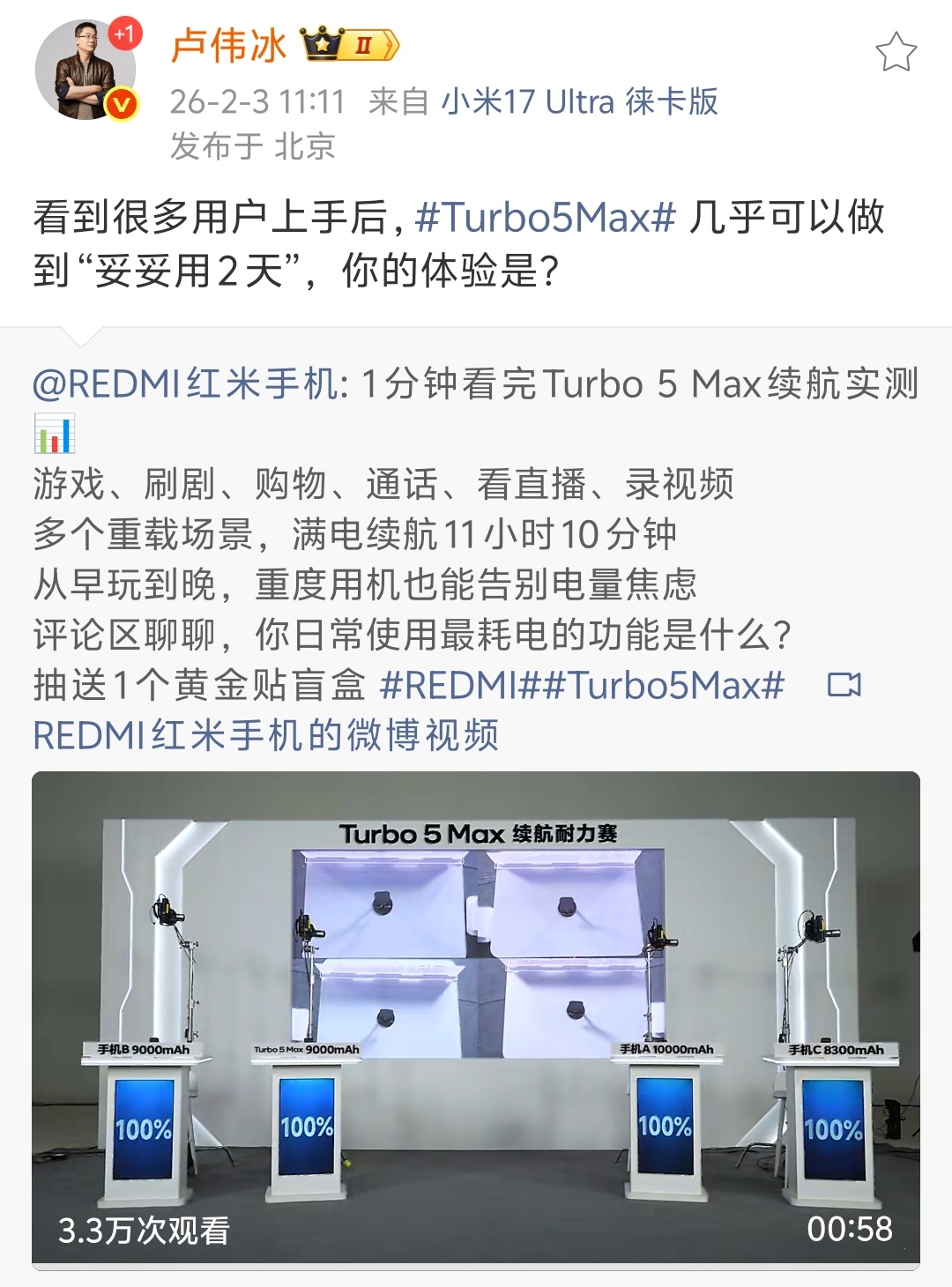 小米卢伟冰:用户上手后称Turbo 5 Max可做到妥妥用2天
