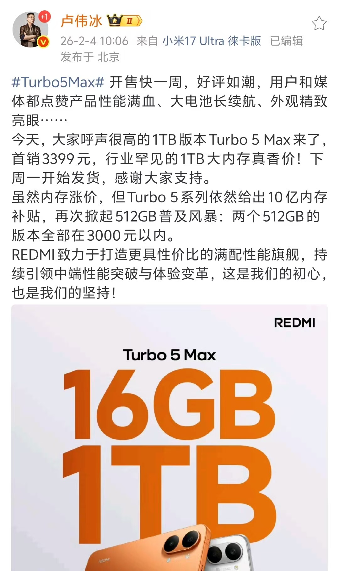 小米卢伟冰:1TB版本Redmi Turbo 5 Max来了 首销3399元