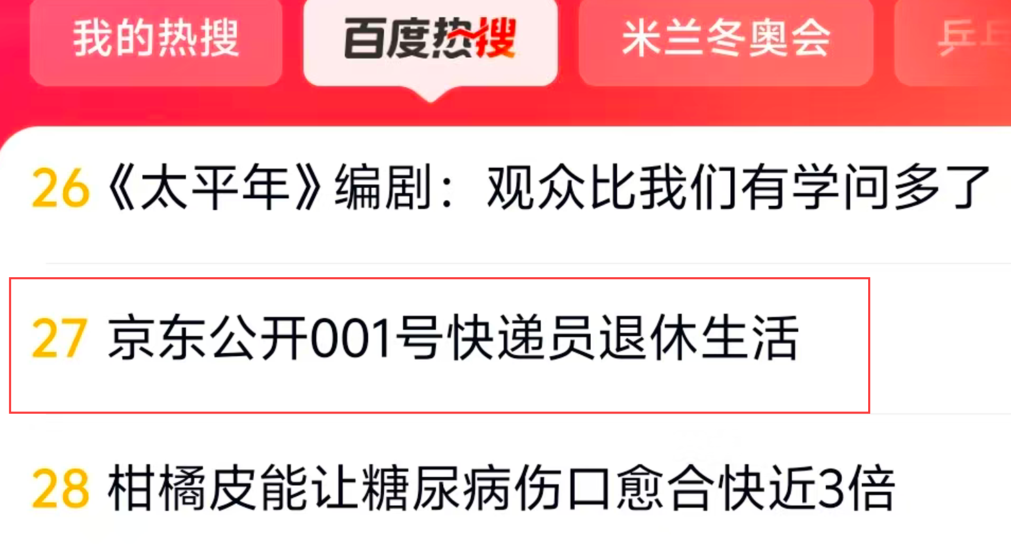 “京东公开001号快递员退休生活”冲上百度热搜
