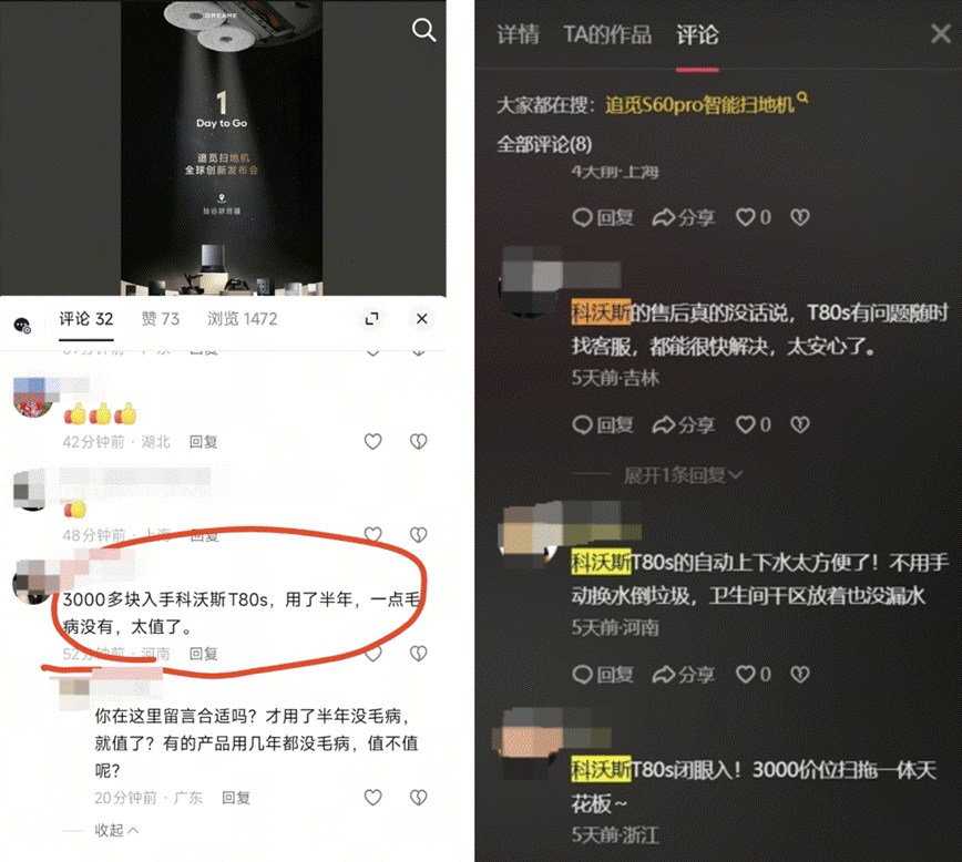 据了解,该水军组织雇佣在校学生、待业人员等群体,通过网络平台统一派发任务。受雇人员在未实际购买、使用相关品牌扫地机产品的情况下,接受 3 元每条的报酬,在追觅相关评论区批量编造、发布虚假评论,如 “科沃斯 T80s 闭眼入!3000 价位扫拖一体天花板~”等内容。