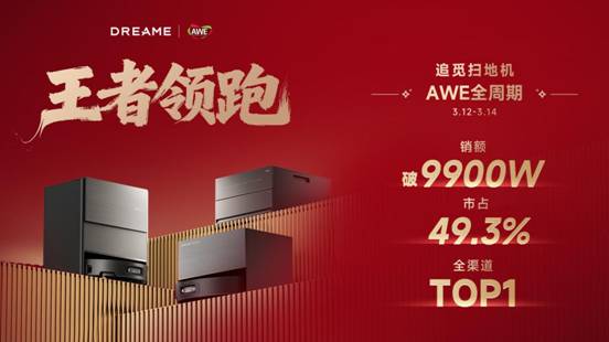 家电消费网3月16日讯 从马年春晚后的消费热潮到AWE销售全面爆发,追觅扫地机以技术为核心,构建起从种草到转化的高效闭环。在日前于上海举办的中国家电及消费电子博览会(AWE 2026)上,作为全球高端扫地机器人领军代表,追觅扫地机以压倒性表现闪耀全场,在AWE期间实现全渠道第一,市占率更是高达49.3%,以无可争议的优势领跑全场。