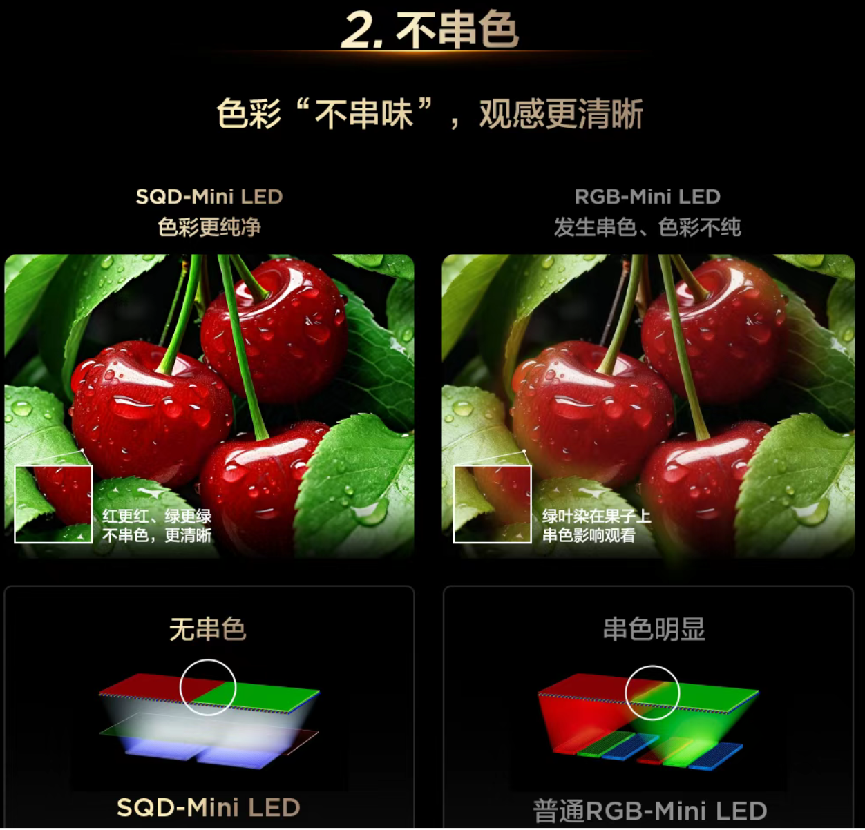1. “无串色”、“不串色”属于绝对化表述,目前没有任何一种背光技术能真正做到 100% 零串色,SQD 只是串色控制更好,并非彻底消失。