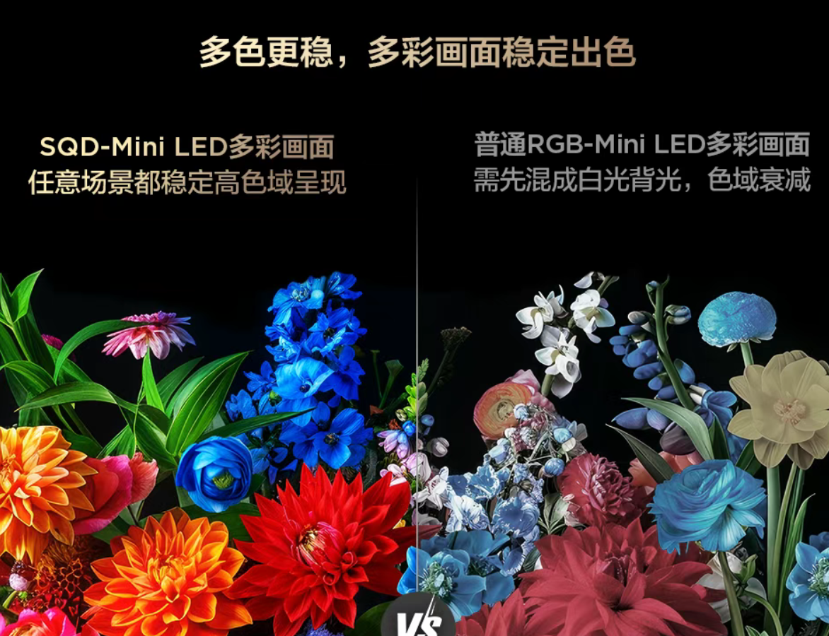 厂家话术:SQD 通过晶粹高色阻+超级量子点,实现 100% BT.2020 全局高色域,任意场景不衰减;普通 RGB Mini LED 需先混成白光,色域必然衰减。