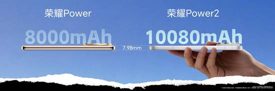 新一代荣耀Power2搭载行业最大10080mAh第四代青海湖电池,相比上一代增加高达2080mAh,续航表现再度突破行业极限,并在TÜV莱茵实验室的标准综合场景续航测试中斩获最长续航手机的佳绩。同时,通过将电池硅含量提升至15%,实现行业领先的926Wh/L能量密度,荣耀Power2将机身厚度精准控制在7.98mm,做到了让续航体验跨越式升级的同时,依然保持和上一代相同的超薄机身。