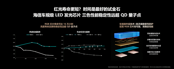 能效上,三色背光发光效率拉满,无需额外补光,能耗较QD-OLED直降30%,光色同控算法还能精准控制每颗灯珠,杜绝无效能耗;海信旗下乾照光电攻克的红色光源技术,更让红光寿命达到16万小时,实现15年不褪色,远超普通液晶电视。