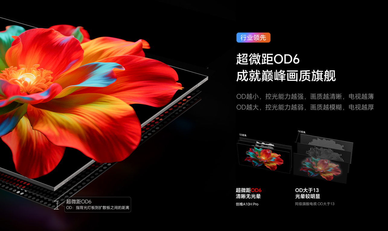 值得一提的是,创维A10H系列是行业首款采用超微距OD 6技术的电视,6mm混光距离在进一步聚光提亮的同时还能减少光晕,使人物和物体的显示边缘清晰分明。乾坤分区+超微距OD 6“强强联合”,将创维A10H Pro的屏幕亮度推向10000尼特的超高峰值。