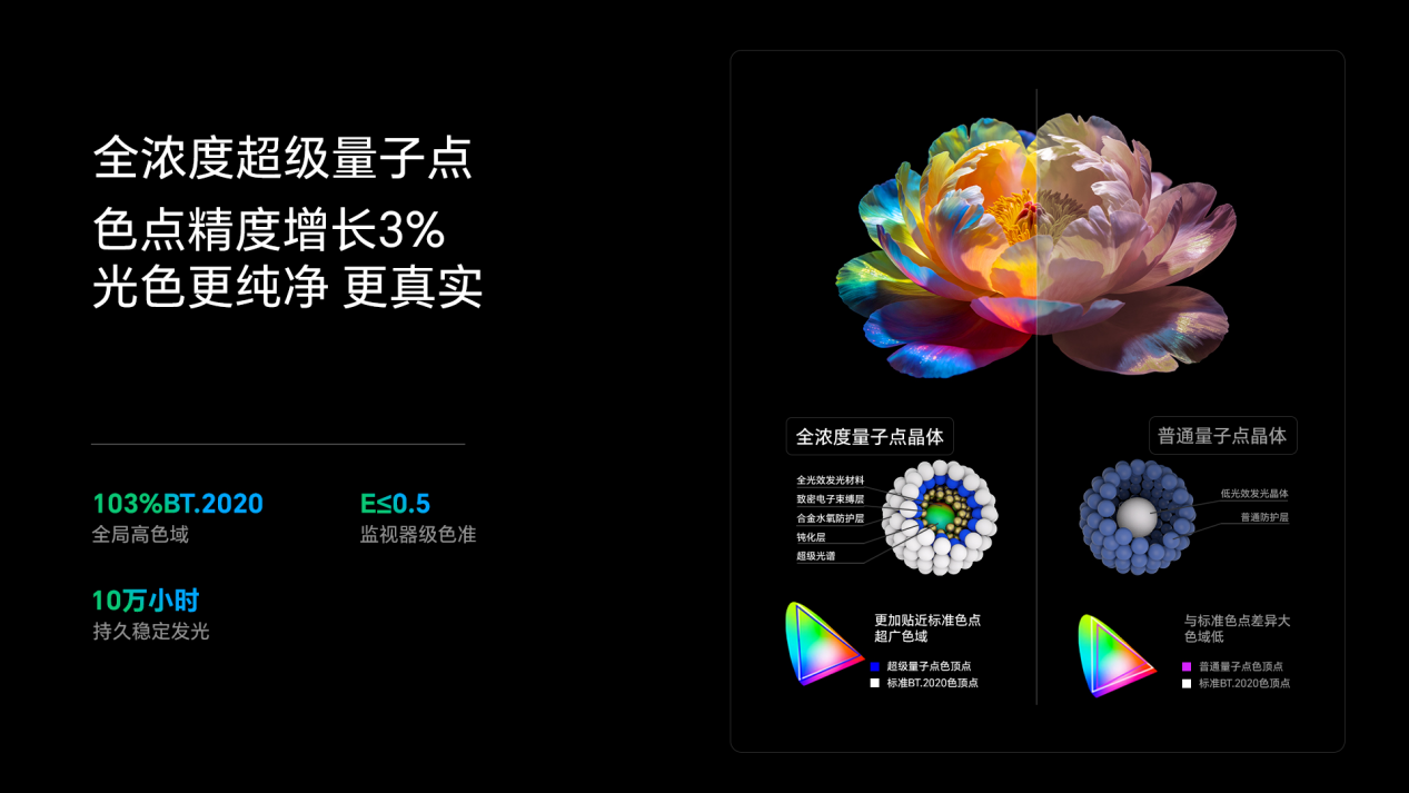 为了充分释放这块屏幕的潜力,创维A10H Pro采用了SQD-Pro第二代超级量子点技术,实现了全局高色域的稳定表现,BT.2020色域覆盖高达103%;独家搭载的「1nm真彩滤光层」更可以精细过滤杂光,使色彩纯净度大幅提升47%,鲜活展现更多色彩。