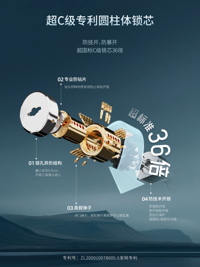 面对这些防盗难题,王力安防自主研发的超C级圆柱体锁芯,从结构设计到材质选用实现全维度升级:外部采用不锈钢360°包裹强化,质地坚硬耐磨损,普通工具无法轻易破坏;内部集成闭门弹子、异形弹子、真假弹子等多重防护机制,一旦感知异常拨动,即刻触发二次锁死功能,从根源上杜绝技术开锁可能;在核心区域植入特制防钻片与防钻销,即便遭遇电钻、开锁枪等暴力开启手段,也能牢牢守住家门防线,让远方的牵挂落地为实实在在的安全感。