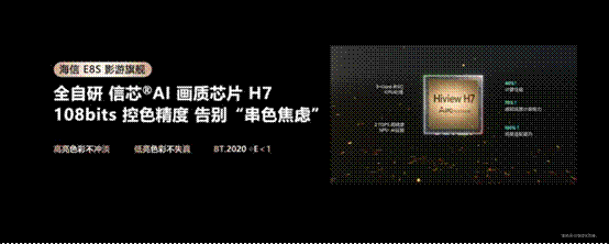 RGB-Mini LED则通过高精度画质芯片实现了全维突破。“三维光色同控”技术的核心难点在于“控色精度”。红、绿、蓝三颗灯珠的发光效率、衰减曲线和亮度必须实现精准同步匹配,否则易出现三色光混合不均、串色等问题,这就对画质芯片提出了极高要求。海信RGB-Mini LED搭载自研信芯AI画质芯片H7,首创三维光色同控技术,可毫秒级同步调控三原色光的强度与配比,支持3×10240级精准分区控制,1个彩色分区的控制精度超越传统3个控光分区;最高配备9360个控光控色分区,配合108bits控色精度,色准ΔE<1,达到专业显示器级别,可满足影视创作、高端游戏等严苛场景需求。